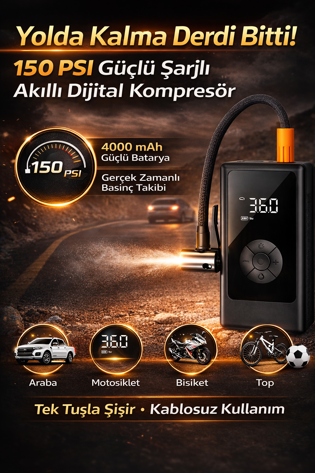 Evet. 150 PSI yüksek basınç gücü sayesinde araç lastikleri dahil olmak üzere motosiklet, bisiklet ve topları hızlı ve etkili şekilde şişirebilir.