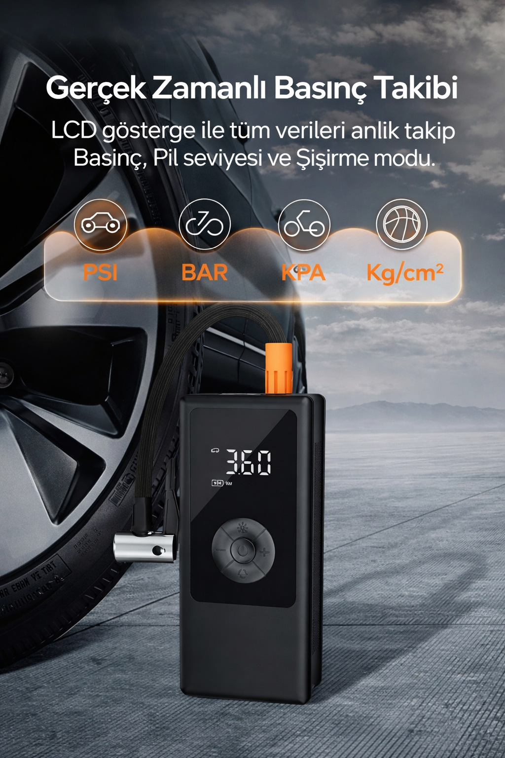 Araç, motosiklet ve bisiklet lastikleri ile spor toplarıyla uyumludur. Kutu içeriğinde bulunan farklı başlık uçları sayesinde çok amaçlı kullanım sunar.