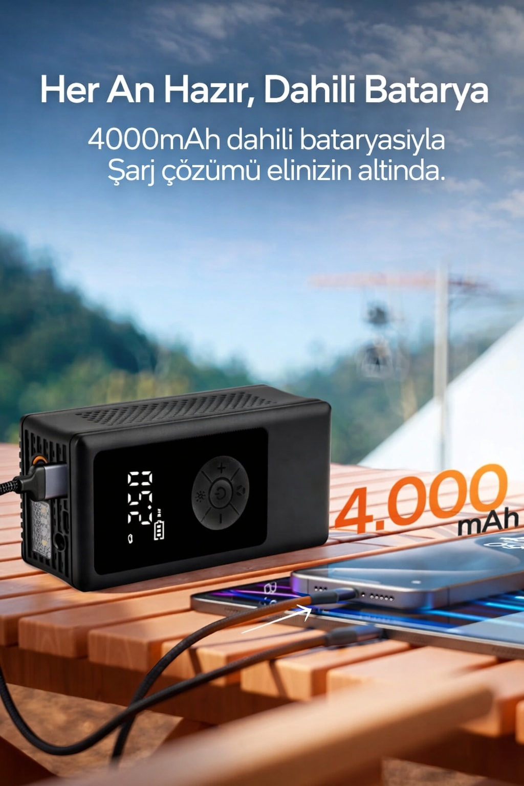 Evet. 4.000 mAh dahili bataryası sayesinde kablosuz olarak çalışır. Elektrik ya da çakmak girişine ihtiyaç duymaz.